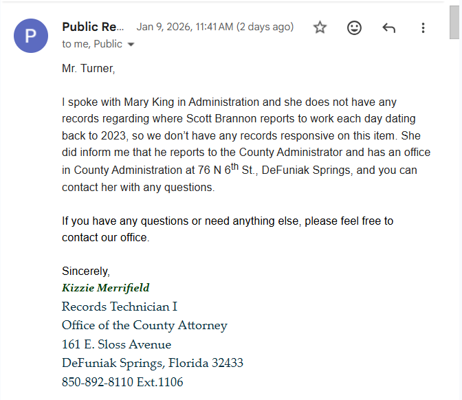 When we submitted our public information request, we asked where Brannon actually works. Meaning…where is his physical workstation that he is supposed to report to each morning?
